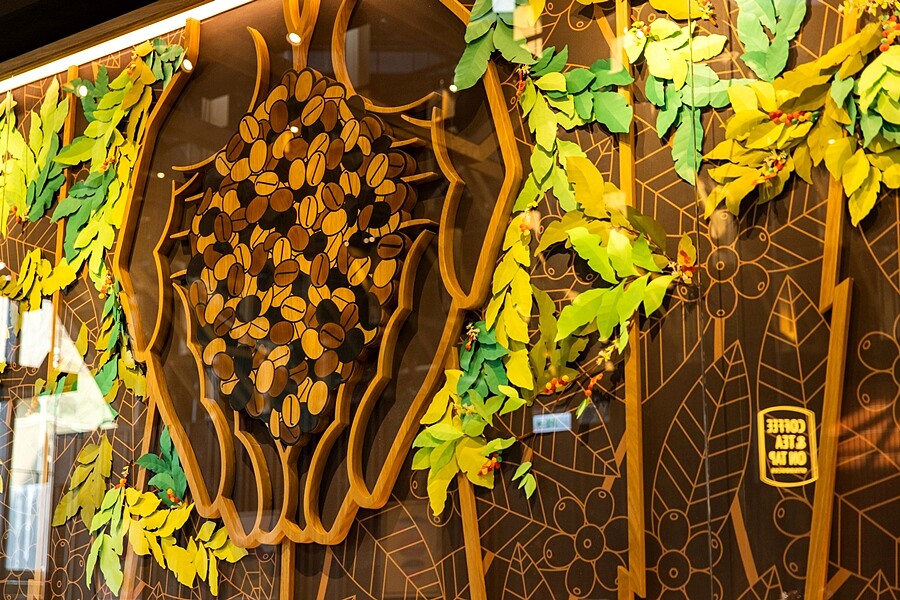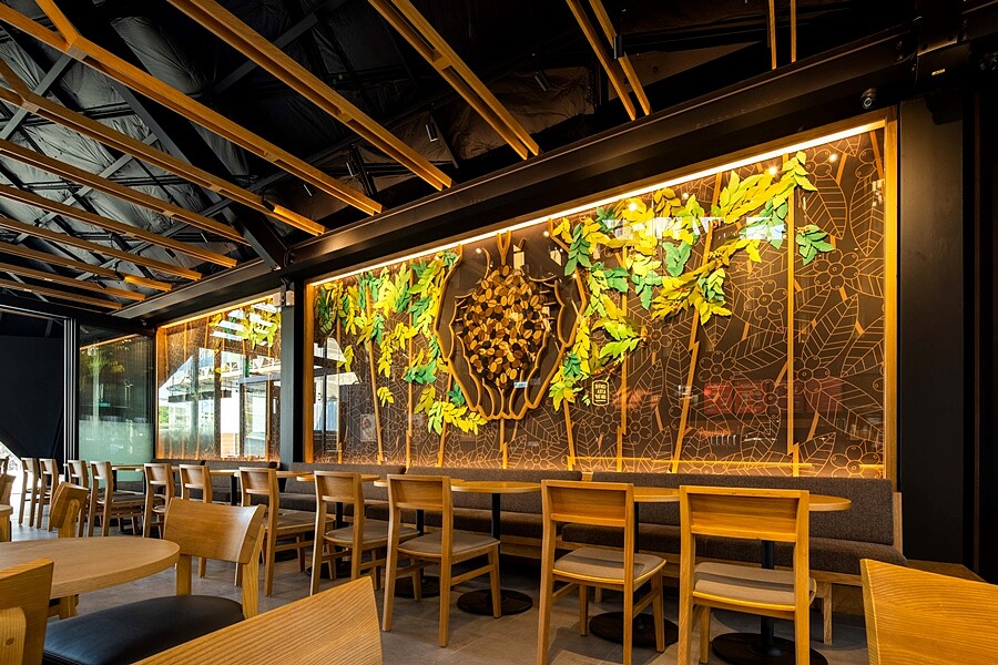 室內還有另一大重點,便是與當地專研紙雕藝術的小吃業者葉成豐,打造一幅描繪咖啡樹、咖啡花開花結果、採收過程的藝術牆面。融入咖啡文化與傳統技藝,適合近距離好好欣賞。