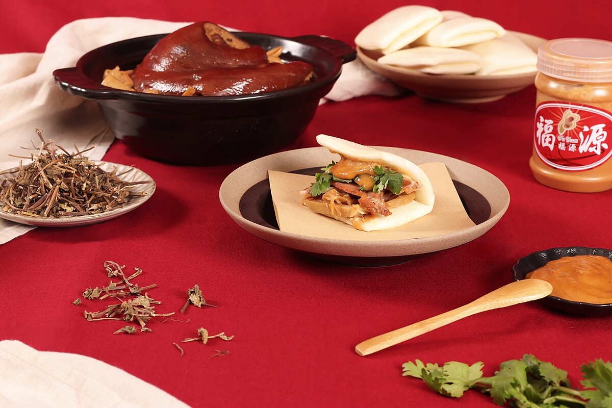 ★台中超人氣小吃『富鼎旺御宴豬腳』以豬大骨高湯加入主廚秘製配方費工滷製,用最簡單的原料呈現出最道地的台灣紅燒腿庫,肥美Q彈的腿庫肉與煙波特製刈包外皮一起入口,清爽又順口,早晨醒胃絕對要吃「鼎旺腿扣刈包」這一味!