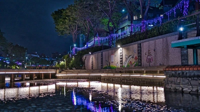 年初因應情人節打造藍色海洋光雕秀,適逢聖誕節,新北市府水利局、新莊區公所及宏匯新北股份有限公司共同合作,再次把中港大排河廊打造人氣網美拍照景點。