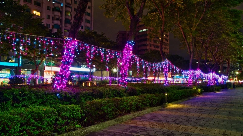 從中原路至願景館的周遭河廊、沿途樹枝,吊掛上絢爛繽紛及閃爍的LED燈,也會隨著時間轉換燈光顏色,讓整條河廊瀰漫著溫馨又閃耀的聖誕節氣氛。最不能錯過的是超夢幻的「粉紅隧道燈海」,有著落葉佈置、蜿蜒延伸感視覺,快趁擠滿網美前去搶拍一波!