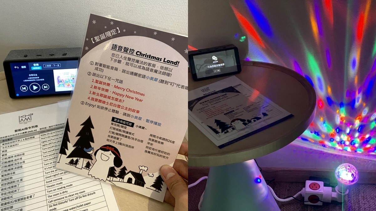 既然是度假,就該好好放鬆!趣淘漫旅-台北將16樓整層升級導入AI智能系統,房間內加裝「Aiello小犀管家」,讓房客們可以「動口不動手」!從調整燈光、房內溫度、提出送物需求,還能播放音樂與周邊旅遊資訊,都只需要「出一張嘴」。甚至說出聖誕快樂、新年快樂關鍵字,便會立刻開啟七彩霓虹燈,待在房內照樣嗨到最高點!