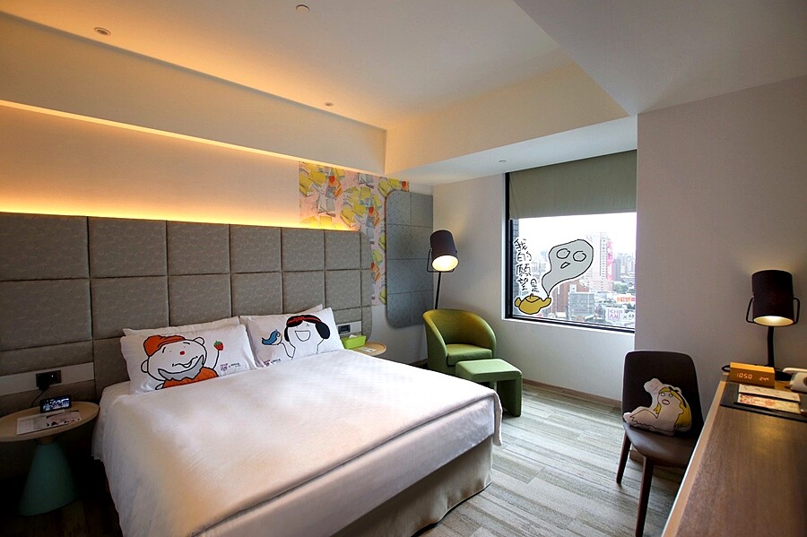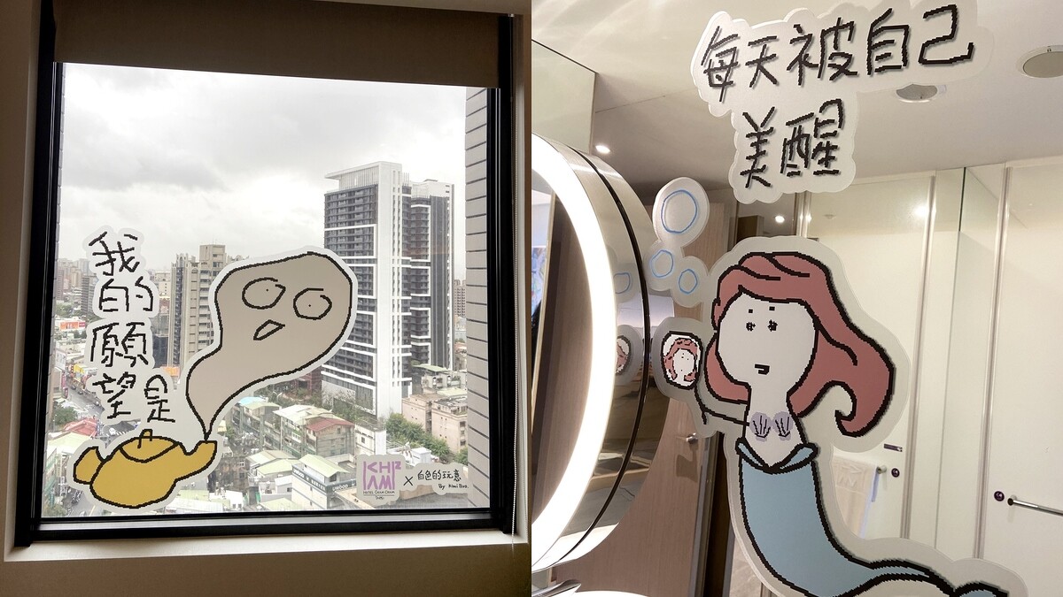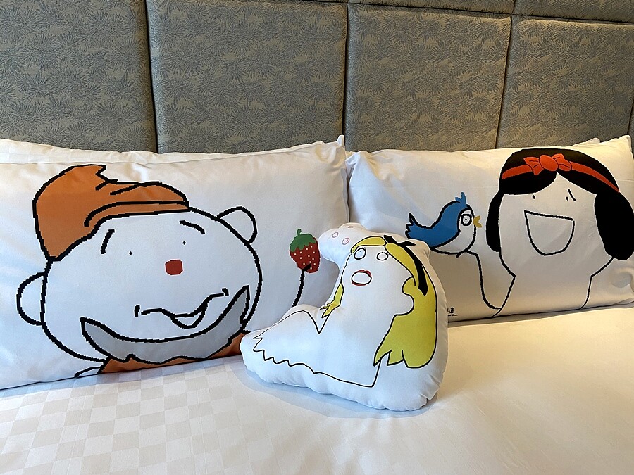 趣淘漫旅-台北攜手你絕對不陌生的人氣Line貼圖「白色的玩意」,打造Kuso風格全新主題房。取材自新北耶誕城的迪士尼主題,特別設計「公主翻玩系列」,從枕頭套、抱枕與特色鏡貼全都能看到幽默又帶點欠揍的畫風,助你拍出另類網美照。
