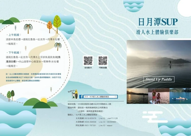 由大毛、大瑋、阿杜三位教練組成的「日月潭sup滑人水上體驗俱樂部」,一年四季帶領著遊客緩緩划進日月潭中央,甚至到達一般遊船不會到達的月潭、月牙灣,用更深入的角度領略如詩如畫的絕美風景。
