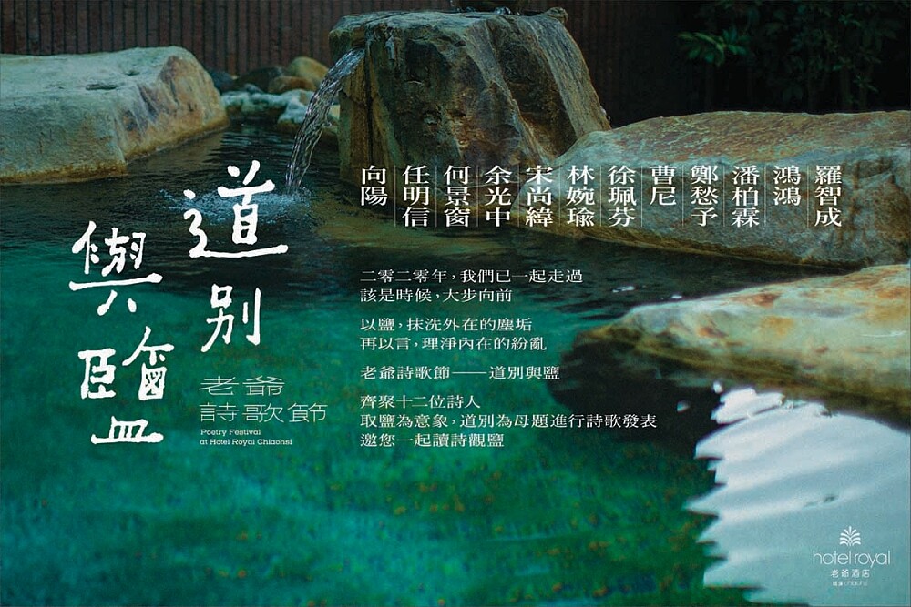 礁溪老爺酒店認為「詩」是從古至今能延長並保存美好記憶的媒介,因此籌劃內容多元的「老爺詩歌節」,集結12位詩人的創作與經典作品,為飯店內外增添不少文藝浪漫氣息。更會發表12天詩歌、線上徵稿活動,用文字的力量陪伴大家走過艱難的2020年。