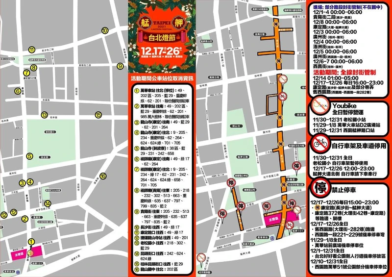 在活動期間,燈區周邊將進行交通管制,部分路段則全線封街禁止通行,包含貴陽街二段(長沙-西昌)、康定路(和平西路-艋舺大道以及西園路一段-梧州)、廣州街(梧州-環河)、浯州街(桂林-和平)、西昌街(桂林-廣州)主要道路,以及舊西園路、康定路(長沙街到艋舺大道)部分巷弄。另外因為活動期間多處停車格取消使用,建議大眾搭乘大眾交通工具前往。