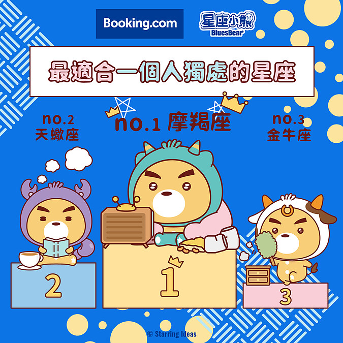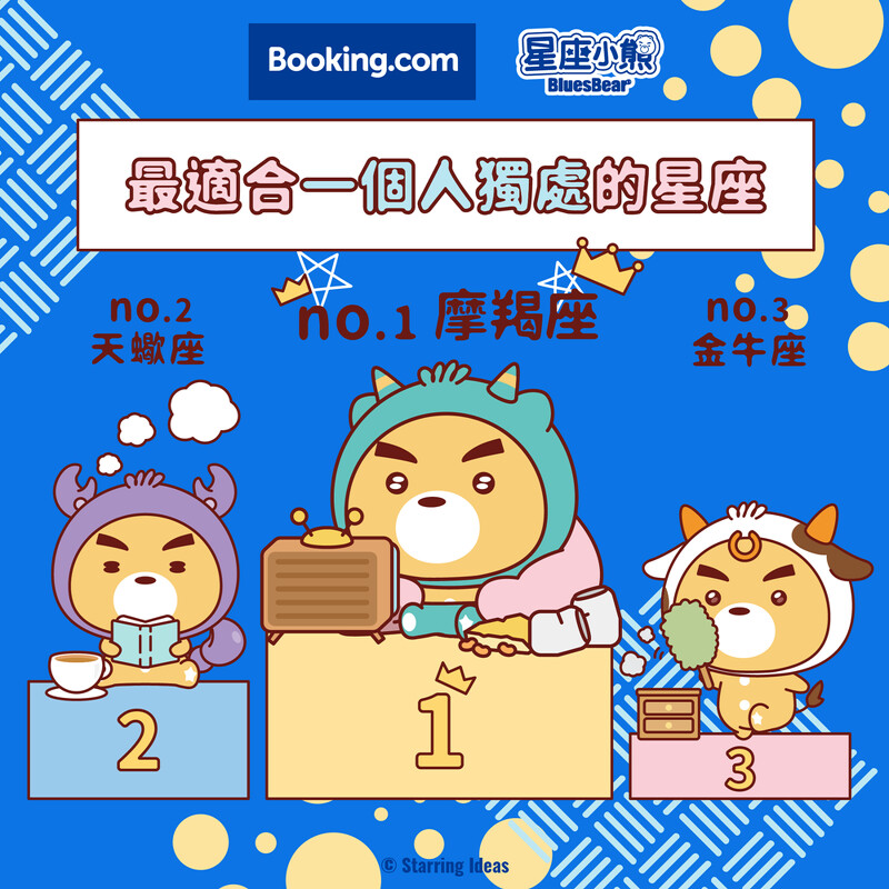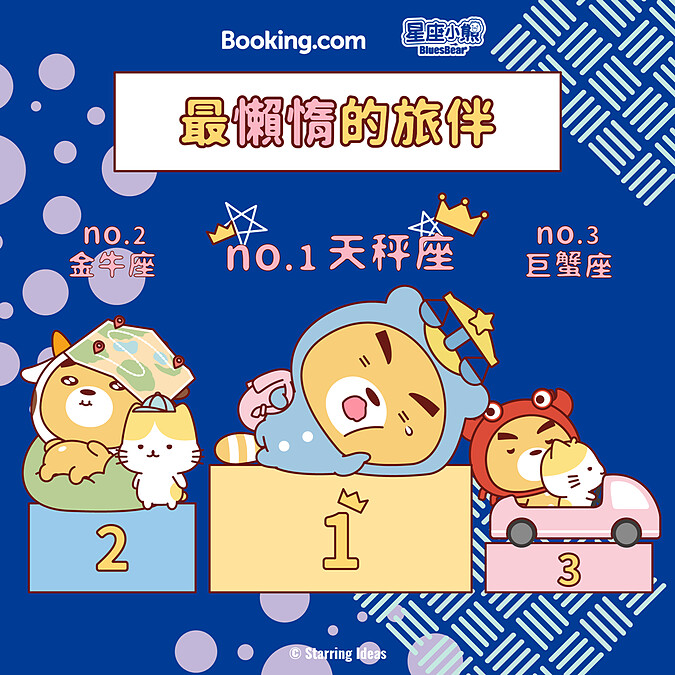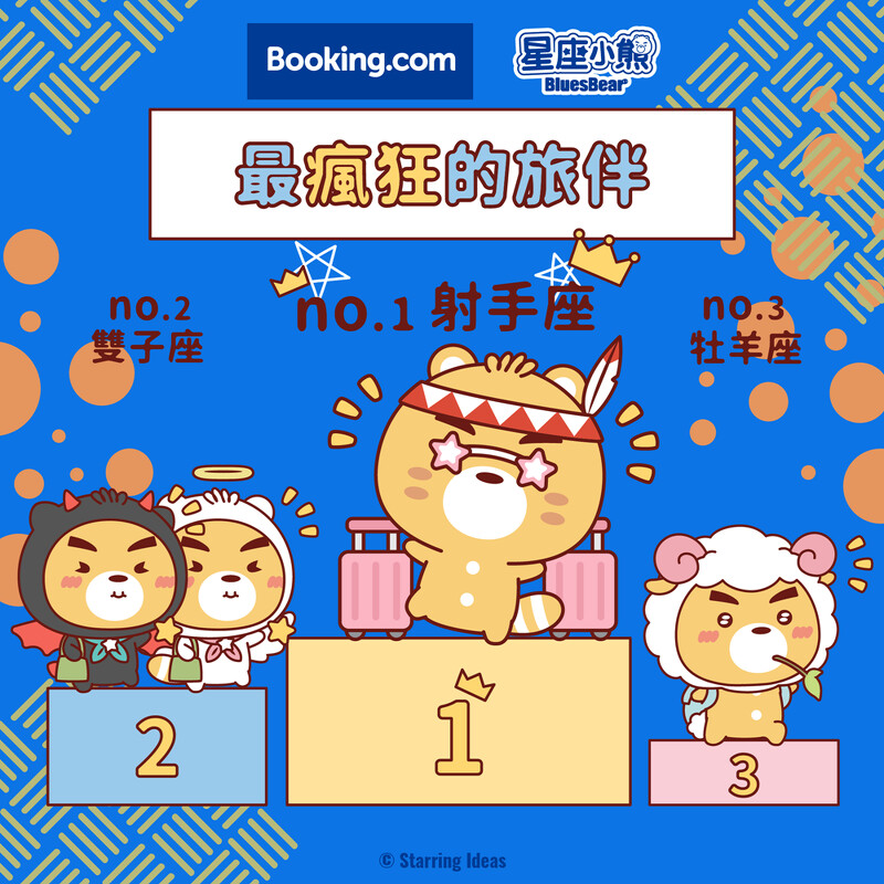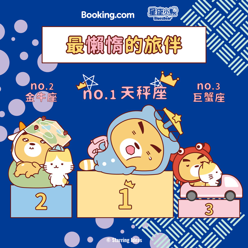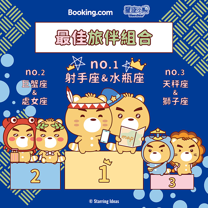 在國旅風潮盛行下,想安排一趟愜意放鬆的小旅行嗎?大家都知道「旅伴」是決定旅程完美的最大要件,在規劃旅程前,可千萬要慎選旅伴!Booking.com攜手星座小熊布魯斯Bluesbear推出「星座特性Top3榜單」,助你找到最適合的旅伴、打造完美旅程。