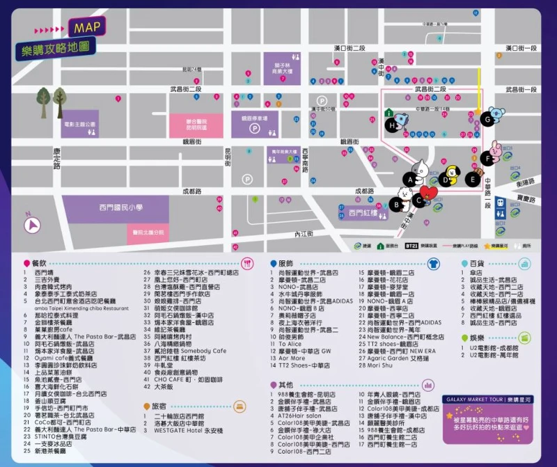 而從1/29開始,圈粉無數的宇宙明星BT21也登陸西門町,坐落6號出口的「出發站」,可以看到7位角色坐上公車,準備好展開旅行!而在商圈周遭則有多達7座大型裝置藝術,有主角們陪伴大家到首爾、開羅、羅馬、卡帕多奇亞、聖托里尼、阿姆斯特丹、紐約各地,讓大家一解出國相思。