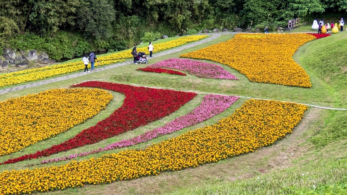 堪稱是賞花秘境的「內湖大溝溪生態治水園區」,即日起至2月底都是最佳觀賞期!捷運大湖公園站僅步行10分鐘即可抵達,更將四季秋海棠、孔雀草、香堇菜等4萬盆花草排列成紅、粉紅、黃、橙、紫等顏色,拼湊出「五色鳥」圖騰。建議以俯瞰角度飽覽繽紛花海,配上自然鳥鳴,成一日舒心小旅行。