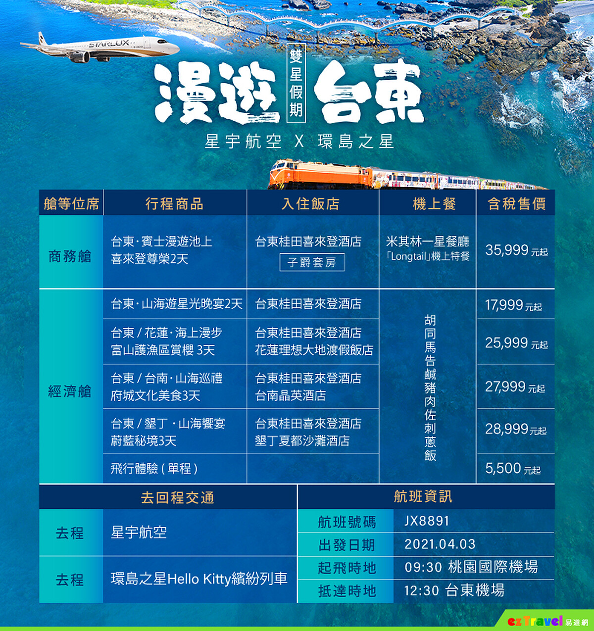 4/3早上9點半出發的「星宇航空X環島之星˙雙星假期 漫遊台東」行程充滿許多亮點,包括是星宇航空首度開設台東航班,有商務艙、經濟艙能選擇。將從桃園起飛、沿著東海岸前往菲律賓上空,再從台灣南部順時針環台飛往台東。商務艙旅客在抵達後,能夠搭乘賓士漫遊池上鄉、入住台東桂田喜來登酒店。