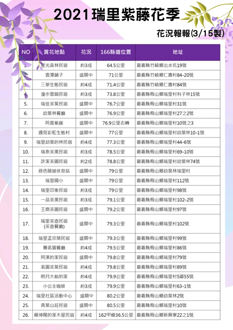 每年3月,嘉義都成為大自然最美畫布,位於阿里山北道的瑞里,在無污染環境中種滿紫藤花,在春季浪漫盛開,濃郁花色、飽滿花穗的串串紫藤花形成短暫卻也極具浪漫情懷的畫面,獲得「紫色山城」美名,吸引大批遊客前往朝聖,宣告旅遊旺季起跑。