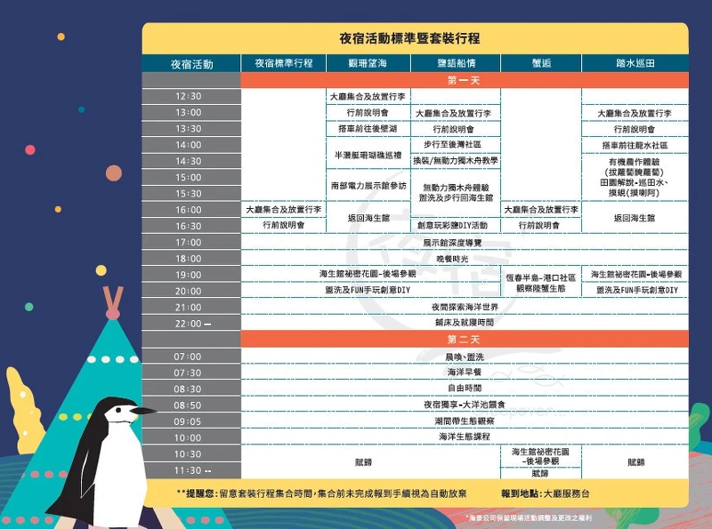 晚間則有重頭戲「夜宿海生館」,遊客們能下榻世界水域館:海藻森林區或鯊魚區,望著湛藍水族館、悠游魚群入夢鄉,勢必成為親朋好友間的最難忘時光。隔天開館前,夜宿者更能享受專屬導覽時刻、大洋池餵食、潮間帶生態觀察、海洋生態課程等豐富知識性活動。費用為每人3180元,在國旅熱潮的這一年,快把握時間去圓夢吧!