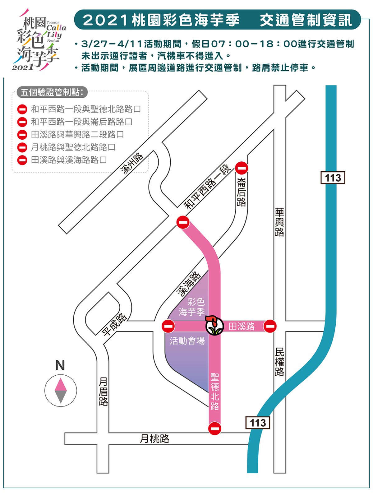 特別注意:每個六日,於和平西路一段與聖德北路交叉口、和平西路一段與崙后路交叉口、田溪路與華興路交叉口、田溪路與溪海路交叉口、月桃路與聖德北路交叉口進行交通管制