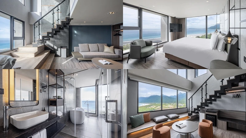 煙波花蓮太魯閣於8月份完工首棟沁海館頂樓房型:晨曦樓中樓套房及沐月樓中樓家庭房,以大面落地玻璃窗引入遼闊海景,也巧妙運用室內空間設計,勾勒出山與海之間的聯繫,讓旅客可以舒服躺在床上、以最大視野面積欣賞東台灣日出,享受難得的觀山望海體驗。