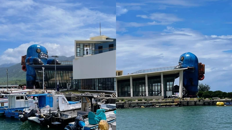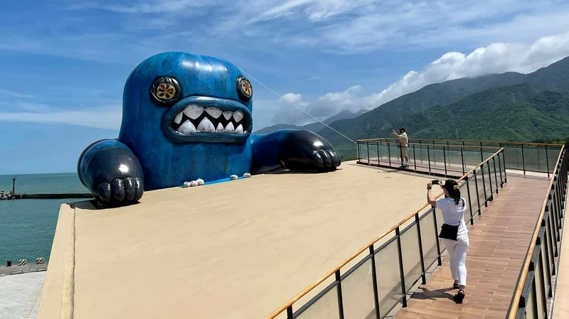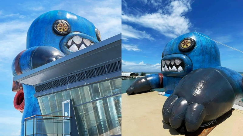「看海美術館」首展邀來國內當代藝術家阿咧策劃「春江獸月夜-阿咧特展」,一樓有20件立體雕塑作品,最吸睛的莫過於巨大的具象化「春江獸」怪獸氣球,來自海底的它浮出海面來到屏東海口、環抱著美術館,觀展民眾得走上三樓才能看到表情、近距離合照。
