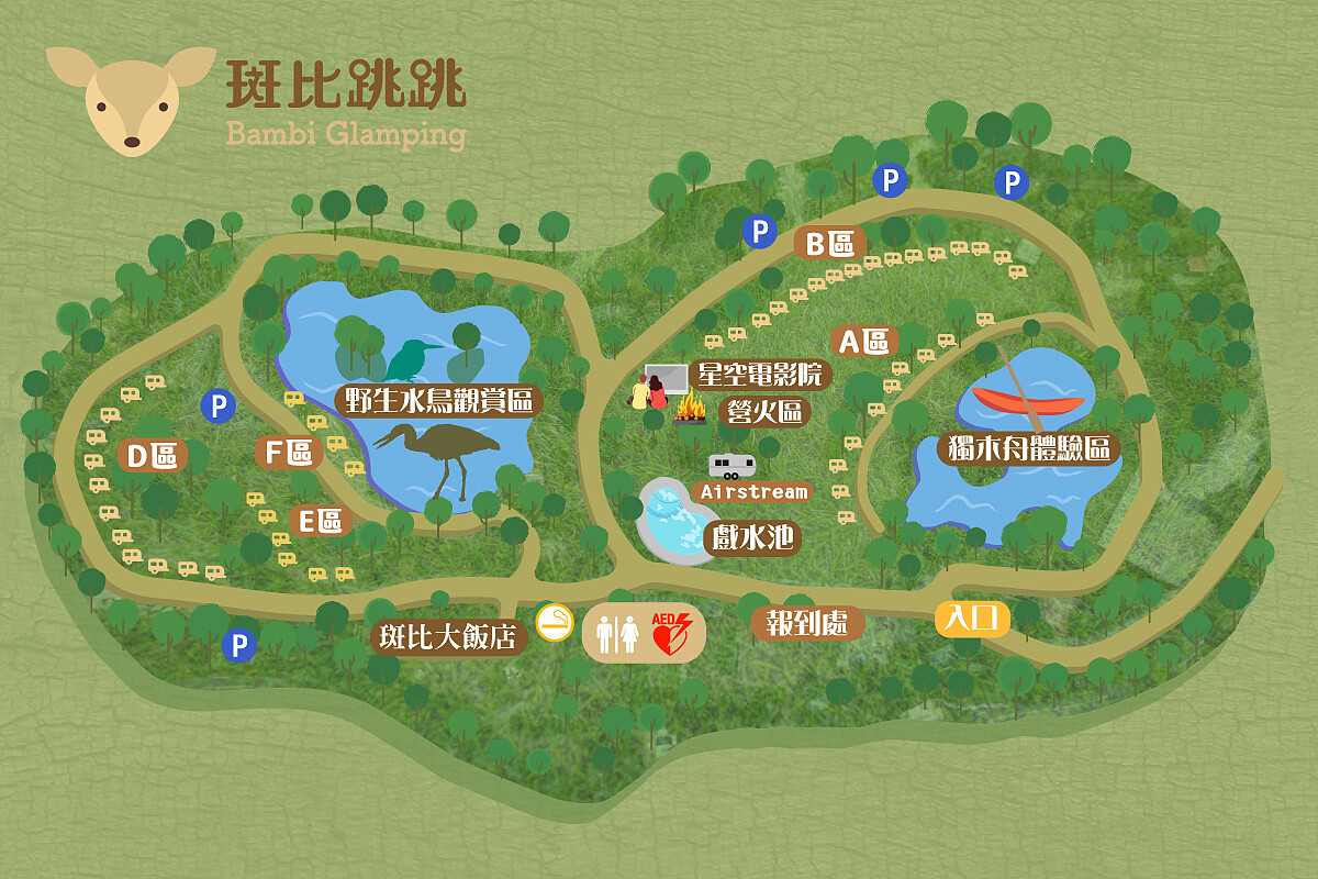 除了愜意享受悠閒的露營時光外,園區內也打造眾多設施供遊客玩樂,官網公開的營區地圖上,能看到規劃了獨木舟體驗區能自在穿梭森林倒影間、日夜皆美的戲水池畔、星空電影院、營火區與野生水鳥觀賞區,以及一台Airstream露營車,滿足大人放空、小朋友放電、網美拍照打卡等各種需求。