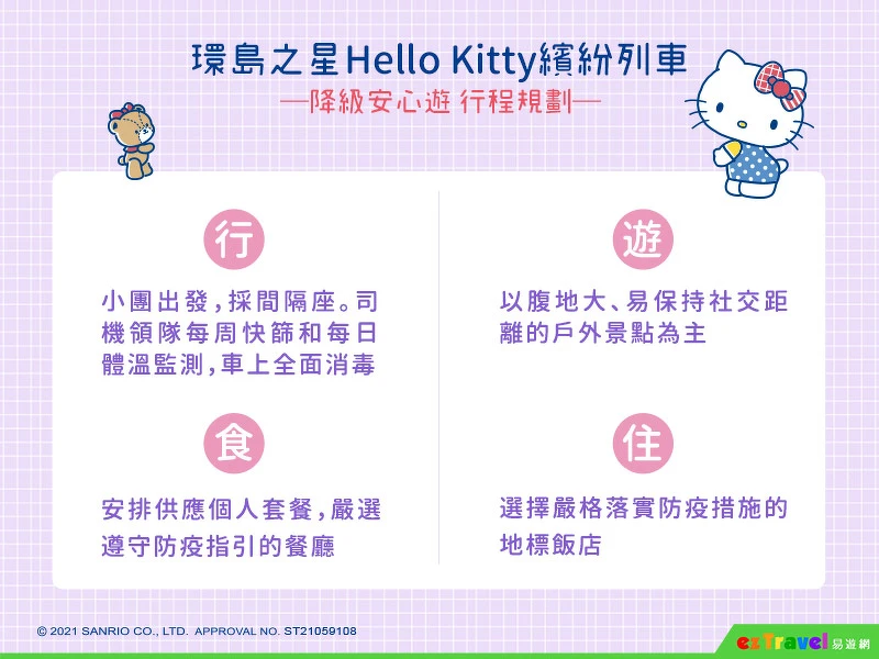 難得暑假出遊計畫都被疫情攪局?隨著降級指示,易遊網聯手台灣三麗鷗、台鐵打造一台史上最萌列車「環島之星Hello Kitty繽紛列車」確定於8/10復駛!為了讓旅客安心出遊,祭出全新6大防疫措施、4大行程規劃要點,還有嚴選三條超夯路線一次看!