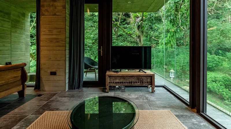迴音谷森林民宿其實不是近年爆紅民宿,早在2007年便開設森林主題一館,2019年打造更都市人嚮往的二館「知櫻楓聆」。整棟清水模建築呈現出水泥原始樸實感受,令人一見傾心。而最大特色是用大面積的玻璃落地窗,能飽覽沙婆礑山的四季翠綠林相,一走進大廳便想放慢腳步好好欣賞四周。