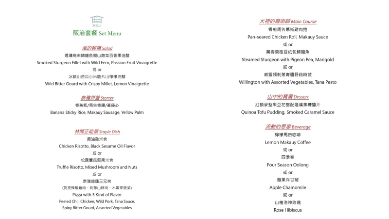 以家屋延伸、傳遞出深耕生長土地意念的Logo,象徵「馥森」的欣欣向榮意涵;「阪治 」則向泰雅族靈魂人物阪治先生致敬;義大利三重奏之意的「Trio」更有著多重意涵,如泰雅族三兄弟,或是場域裡的溫泉、美食、音樂元素,甚至到餐飲中的原民風味、在地食材、健康蔬食皆能涵括在內。