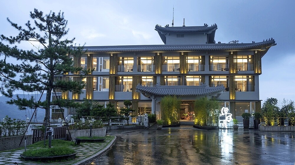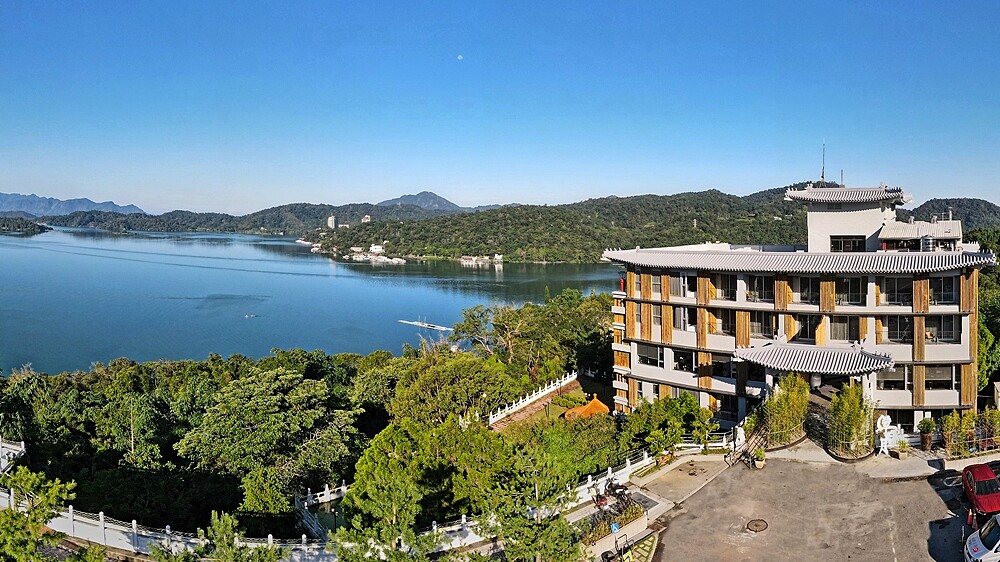 「承億文旅潭日月」位於文武廟前,樓上樓下共7層樓,保留原先飯店舊有結構,並將外形特地「噴灰」,打造成一棟充滿靜謐美學的灰色雕塑,完美隱入日月潭絕景之中。