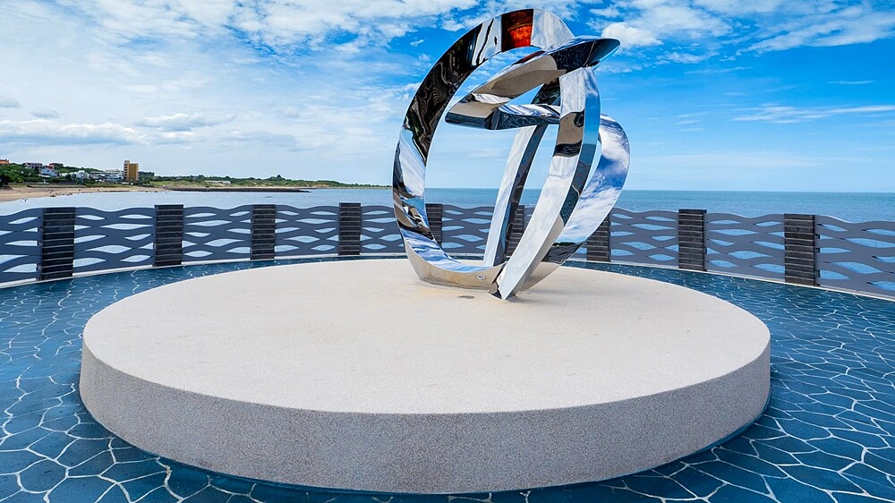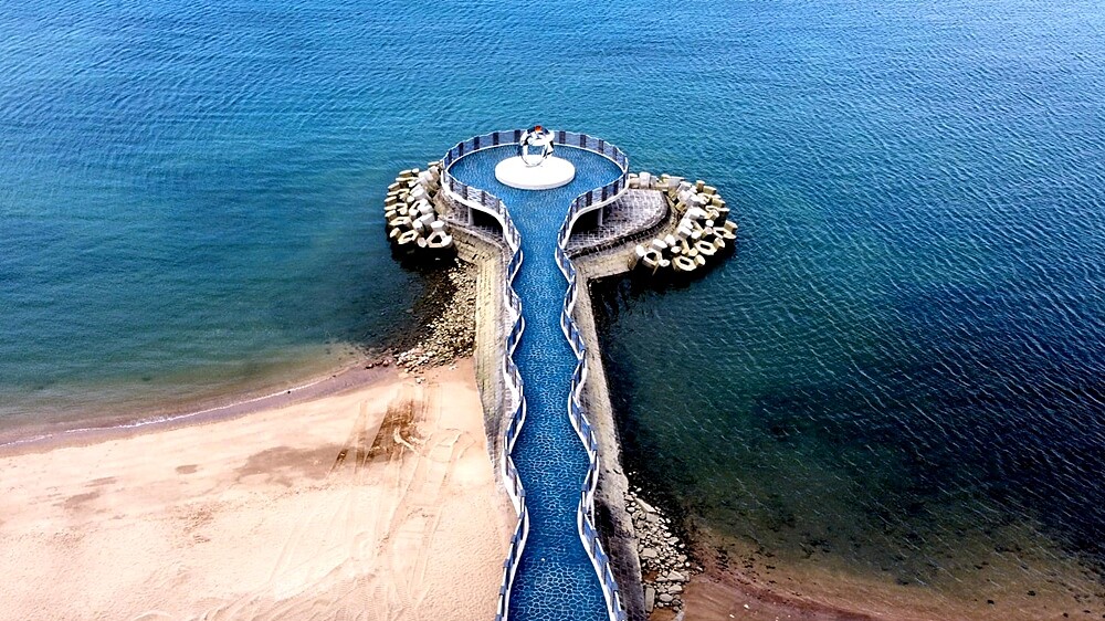 從高處看,「芝蘭公園海上觀景平台」為一條由岸邊延伸出57公尺長的水藍色波浪長廊,近看會發現藍色系色地板圖案、波浪造型護欄,皆傳遞著迷人的大海意象。而盡頭終點處有三芝當地藝術家胡棟民操刀、市府環境美學顧問陳俊良指導完成的「閃亮婚戒裝置藝術」,暗藏著「以緣為意、同心為象、指環為形」浪漫理念,勢必吸引不少情侶前往拍照留念。
