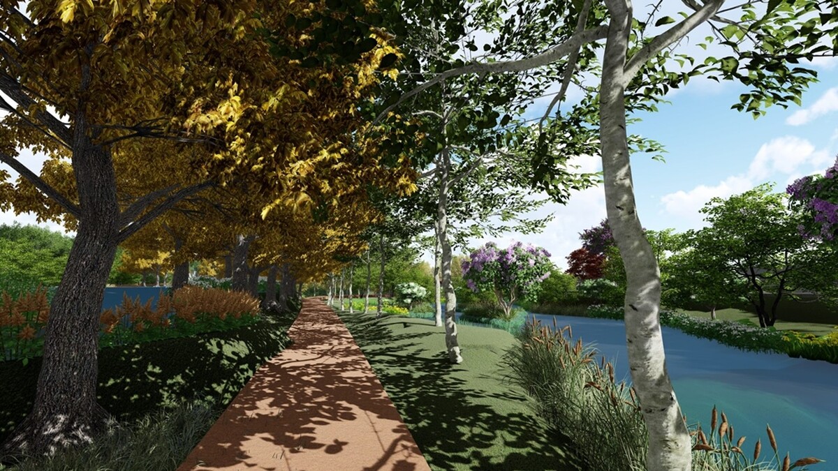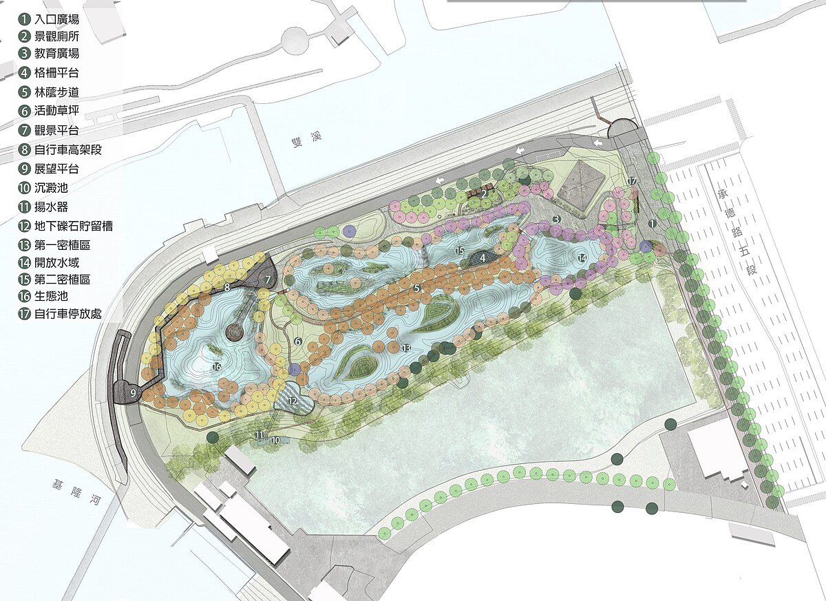 該園區內的最後一個場域「雙溪濕地公園」已於6/30開工,將獨特地理環境改造成人工溼地,透過引進士林抽水站前池水源、調整公園內地形與植栽設計,打造出一座「戶外生態教學教室」,具備淨化水質、減少對水域汙染的效果。