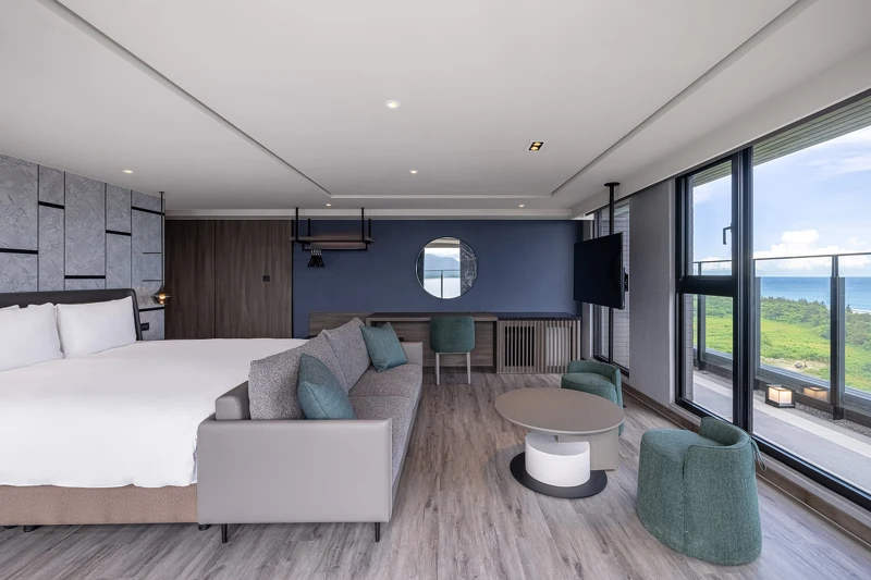房型以簡約俐落設計及內斂配色,偕以自然溫潤木質提增暖度,大片玻璃窗引進明亮的光譜,勾勒室內空間與自然山海的聯繫。旅人於房內即可以最大視野慢享晨起賞日出、落暮賞月出,以及全日的觀山望海體驗。