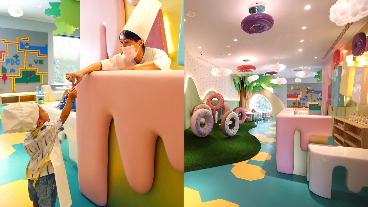 另外雲品溫泉酒店還把丹彤西餐廳的閒置空間重新規畫,打造成適合3~7歲的專屬空間「VIK Kids Land」,空間面積約25坪大,用綠地、木製樹林、雲朵造型燈、大型冰棒及甜甜圈造型裝飾營造出夢幻風格。同樣開放住客於下午茶、晚餐時段以兩小時為單位包場,每場最多容納10人,晚餐期間還會準備內含小熊飯糰、小狗麵包的餐盒,讓小朋友盡情放電玩耍。