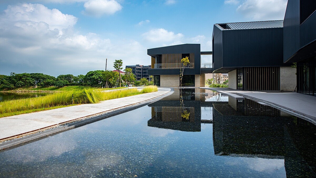 斥資2.6億元、沿用傳統地名打造的「橫山書法藝術館」,為全台首座由官方經營之書藝主題館,座落青塘園生態公園旁,為青埔地區更添一處必訪景點!建築師潘天壹將埤塘作為「墨池」、藝術館則為「硯台」為意象規劃園區,主體建築有如五方篆印,更加強自然採光、結合水岸景觀,在藍天白雲映襯下更顯特色獨具。