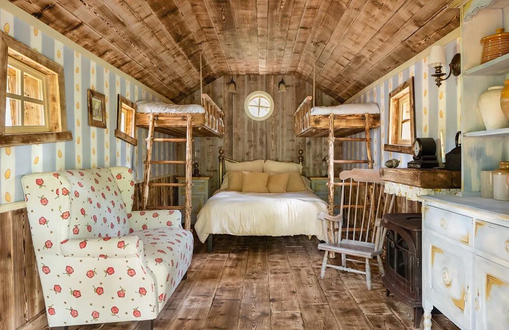 進入房間後肯定會引起一陣尖叫!映入眼簾的是一張雙人床,兩側各有一張吊床,最多能容納4位旅客入住,而衛浴設備則在幾步之遙的外頭。室內更擺放一座淺藍色櫥櫃,上頭放滿了蜂蜜罐,壁紙、沙發則有小碎花設計,再加上一張搖搖木椅,呈現出溫馨復古風格,相信任一處都會令維尼控拍到失心瘋。
