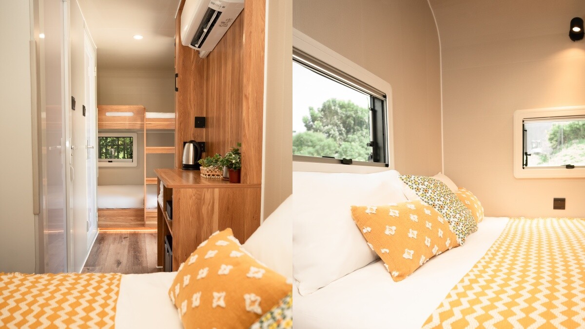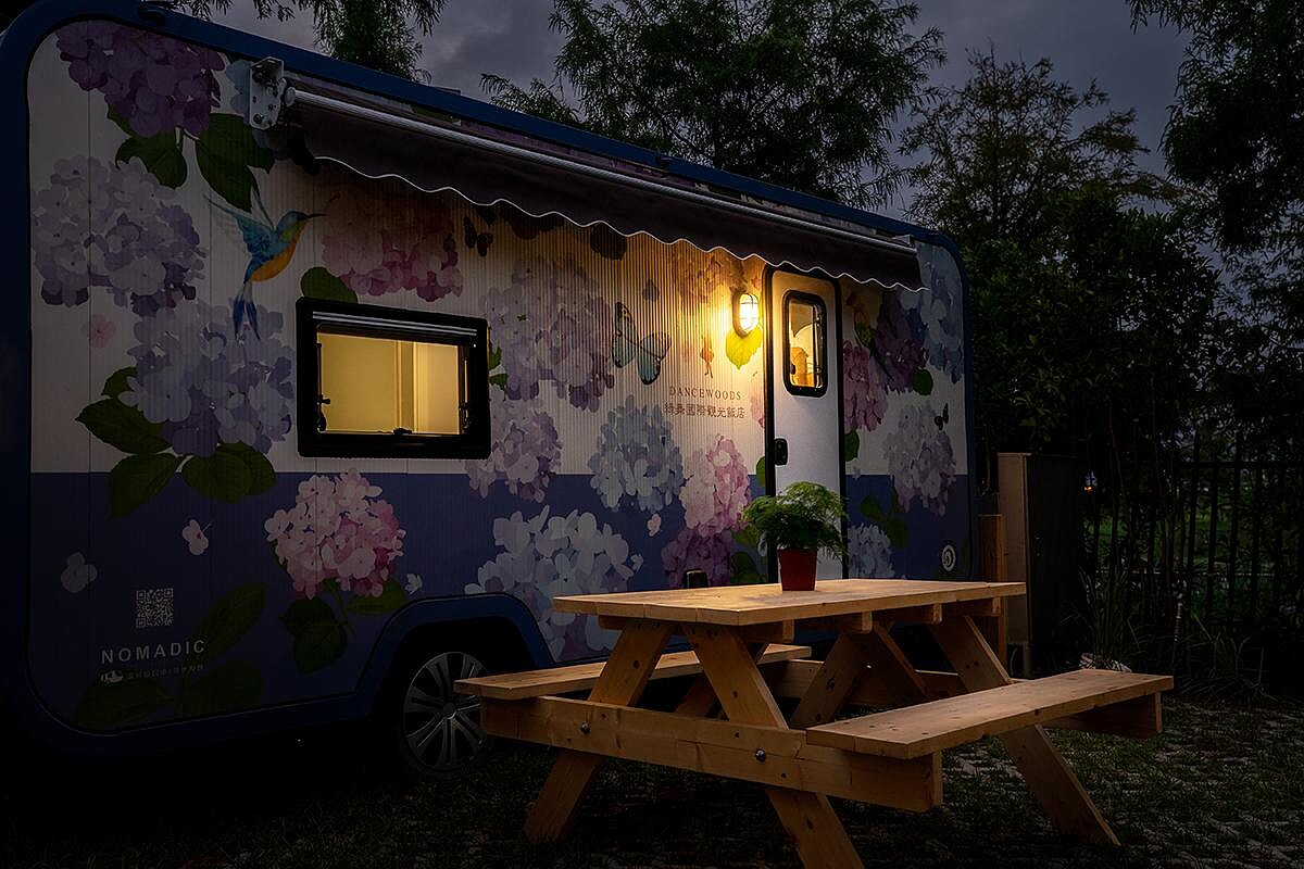 溫馨舒適的露營車座落於園區中的落羽松內,讓大家露營無需手忙腳亂搭帳篷啦!露營車外觀是夢幻的紫藤花圖案,裡面內裝以木質色調為主,有一張雙人床及一張上下鋪的單人床,可以容納4人,還有簡單的櫃子等,整體小巧而精緻。