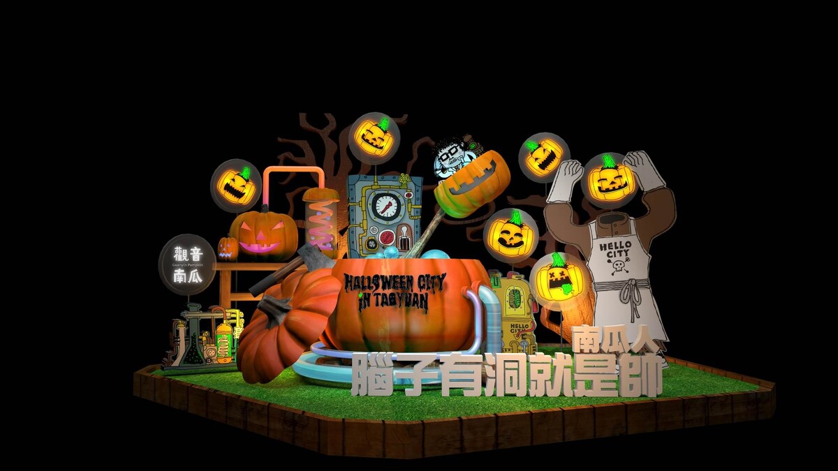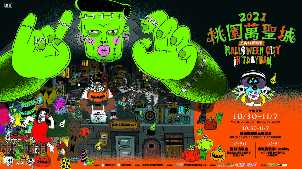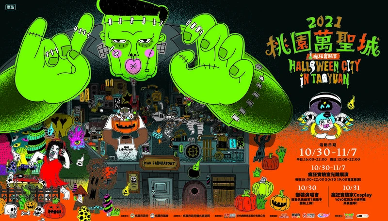 將於10/30登場的「2021桃園萬聖城」,活動找來多次獲得金犢獎、金點設計標章的插畫師Saku設計,整體視覺以「瘋狂實驗室」為主題,並以深藍色、橘色、綠色或現場換上吸睛主色調。而去年人氣角色南瓜人及骷髏人會換上全新裝扮外,更打造全新的科學怪人、螢光小女孩、拜金蜘蛛等新角色,各個埋首於自己的研究,值得遊客一探究竟。