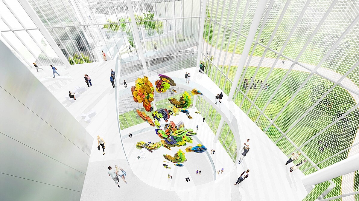 斥資32億元打造,「台中綠美圖」總樓地板面積為58106平方公尺(約17577坪),其中5棟建築的一樓空間都刻意挑高為戶外廣場,提供一個能休閒散步的舒適公共空間。建築師妹島和世加入「以人為本」的理念,將擅長的玻璃外牆元素,讓8棟大小不一的建築物營造出穿透性與流動感,純白色外觀也是令人期待的設計亮點。而空透的建築設計,則能讓民眾視線穿透,每次造訪都會有耳目一新感受。