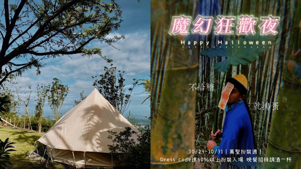 想到大自然體驗一場豪華露營,也能有萬聖節氛圍!座落南投竹山鎮海拔1000公尺以上的豪華露營區「山思雲想」,10/29~10/31展開期間限定的「魔幻狂歡」派對活動,有秘密儀式外,完成萬聖節裝扮便能免費獲得調酒一杯。期間內會看到魔幻裝扮遊客在森林裡流竄搖擺,玩累了就能直接在舒適帳篷入夢鄉,是一場極具特色的山中搞怪派對。