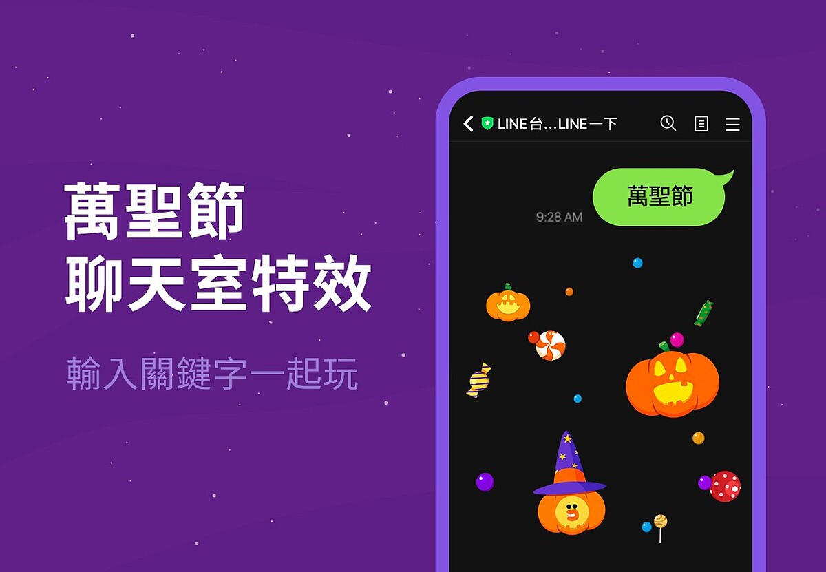 如果想要宅在家,也可以簡單用LINE分享節慶感,只要在任一聊天室輸入「萬聖節」、「搗蛋」、「Halloween」等關鍵字,會立刻看到超可愛的熊大、兔兔、莎莉在背景中探出頭!時間只到11/1早上10點,快抓緊時間玩特效!