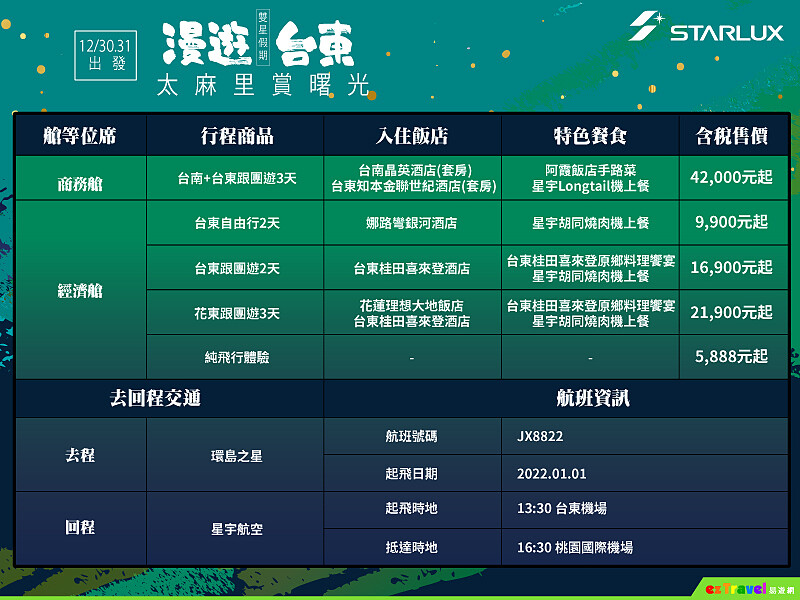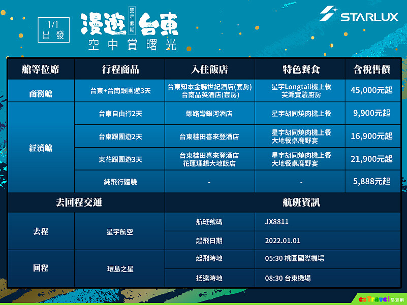 雙方合作的「雙星假期 漫遊台東」推出第2彈,這次結合空、陸兩大交通,旅客將從2022/1/1早上5點半從桃園國際機場起飛,行經日本宮古島上空,在2萬英呎高空上以繞圈方式飽覽2022年第一道曙光,隨後折返宜蘭外海、南下至恆春,再往西港後折返欣賞東海岸風景,並於8點半降落台東。這不只能一解大家久違的飛機癮,還可以吃到星宇航空別具話題的飛機餐、獲得星宇周邊禮包,而最令人動心的,便是能在機上迎接2022年第一道曙光,在新年之初便留下深刻畫面。純飛行體驗,5888元起。