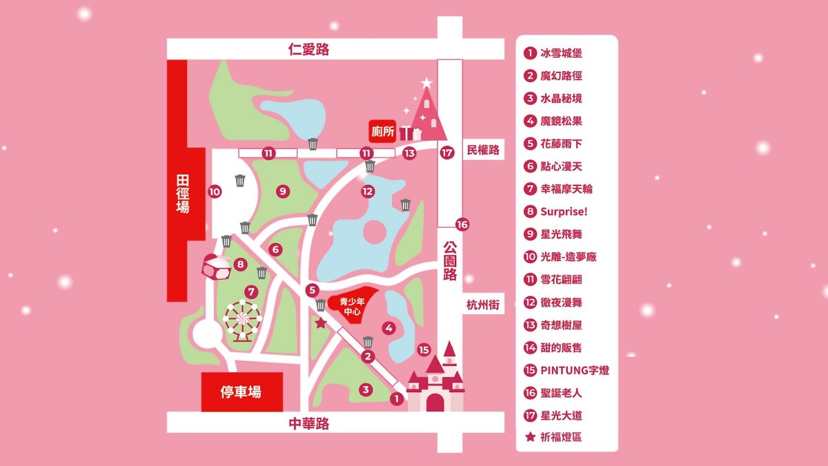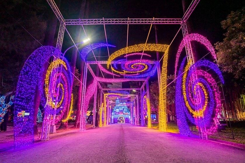 17座奇幻繽紛燈飾散落分布於屏東公園各處,甚至還有「幸福摩天輪」、繽紛燈海隧道「雪花翩翩」、湖畔上白天鵝燈飾構成的「徹夜漫舞」、光雕秀都不容錯過。每個周末(12/4、5、11、12、18、19、24、25、26)還有「聖誕村下雪了」、「聖誕網美拍貼機」、「聖誕老人來臨」、「聖誕發糖果」等豐富活動,大人小孩都能玩到心滿意足。
