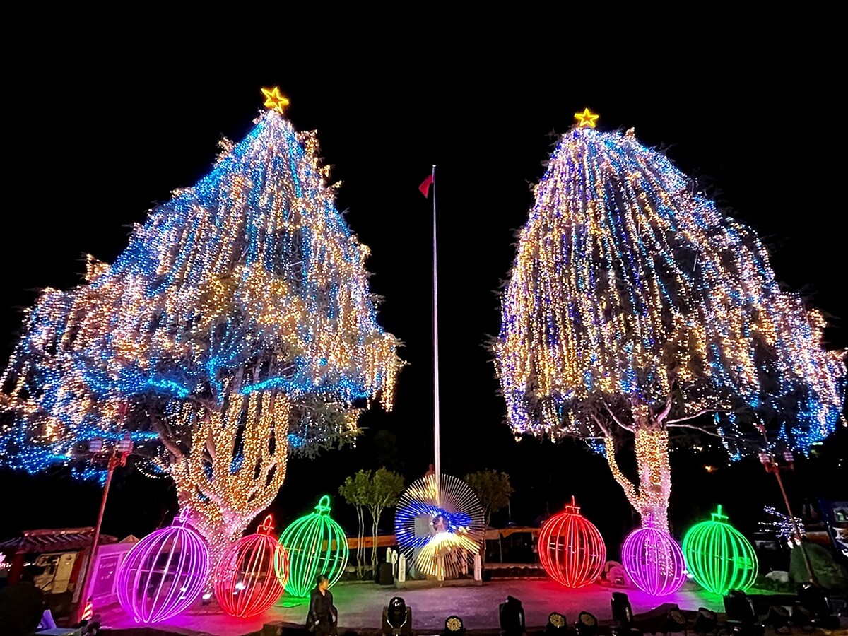 全台最高聖誕樹現身!交通部觀光局參山國家風景區管理處首次舉辦的「2021山谷燈光節」 ,在海拔1956公尺的梨山賓館前打造兩棵高達28公尺的雪松聖誕樹,擷取梨山風景區中特產:水蜜桃、梨、蘋果與甜柿出「梨山金」 ,並化身數萬顆LED點亮山頭,即日起至2022/1/2絢爛點燈,戶外咖不妨親眼見證有多美。