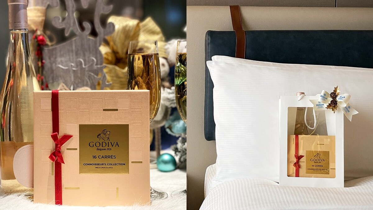 距離新北耶誕城主場地只需要4分鐘步行路程的台北新板希爾頓酒店,首度攜手GODIVA、即日起推出「暖流來希」聖誕住房專案,房價只要加價600元,便能享有「希爾頓限量聖誕禮包」,內含GODIVA「片裝牛奶巧克力禮盒16片裝」、精選西班牙粉紅酒一瓶,為兩人約會行程持續加溫。