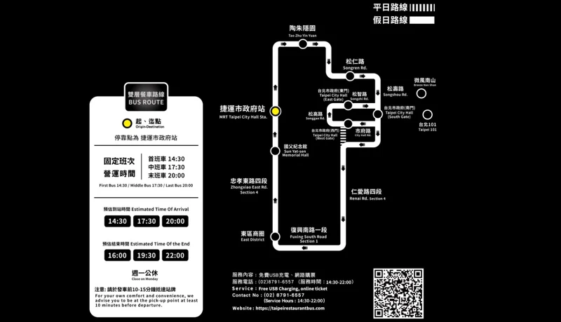 「臺北市雙層餐車」每天出發,起訖點為捷運市政府站3號出口,路線將行經陶朱隱園、松壽路、市府路等信義商圈及東區商圈。有下午茶14:30(提供法國經典麵包布里歐海陸雙堡、瑪德蓮、可麗露等甜點)、晚餐17:30及20:00三個時段能選擇,最早可於出發前3天預約、最久可預約90天後的車次,最低預約人數為2人、最多4人。每周一保留給企業團體包車。