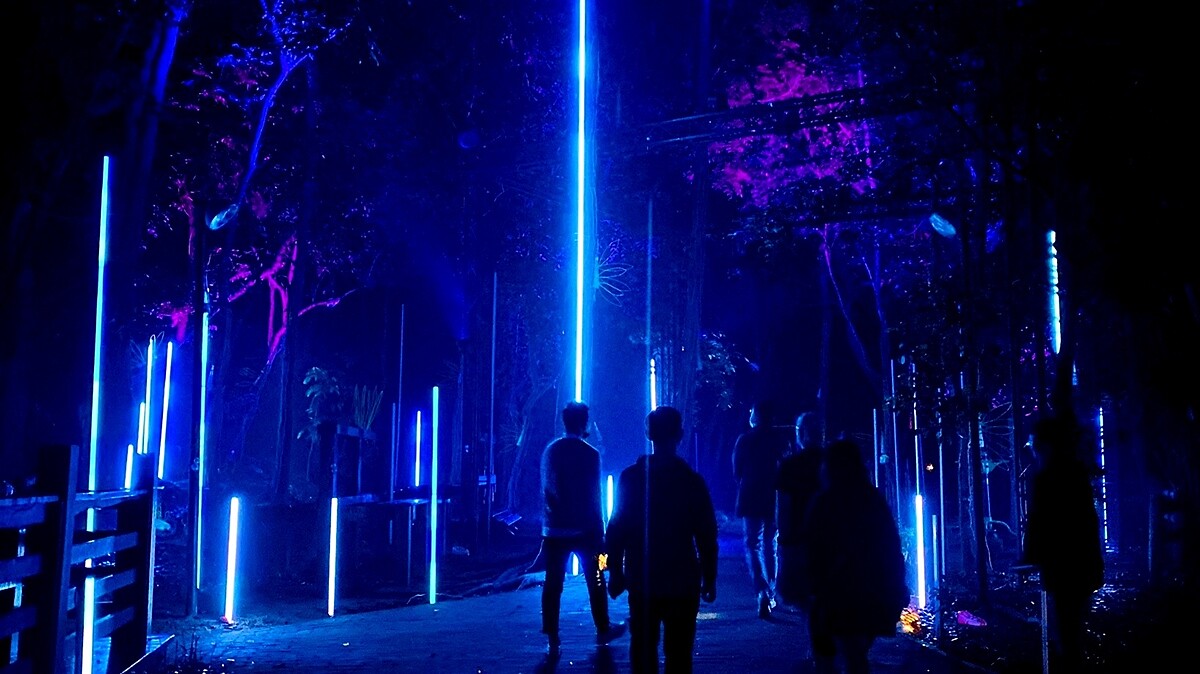 本屆延續一貫的「寓言式」策展,將動畫《惡地伏流》作為策展核心,14件大型作品環環相扣、共同演繹。像是當地自然落木搭建的《泛舟種子》,種下帶有萌芽的希望意涵;《九號基地-爆破邊界》則用5公尺大型充氣裝置敘說過去身為炸藥兵工廠的歷史;《光洞》透過螢光投影,為竹材、鐘乳石結構創造炫目打卡景點。《世界樹之泉》則結合燈管、LED螢幕及投影,並加入科技藝術手法元素,打造出一片流動的迷人夜光森林。