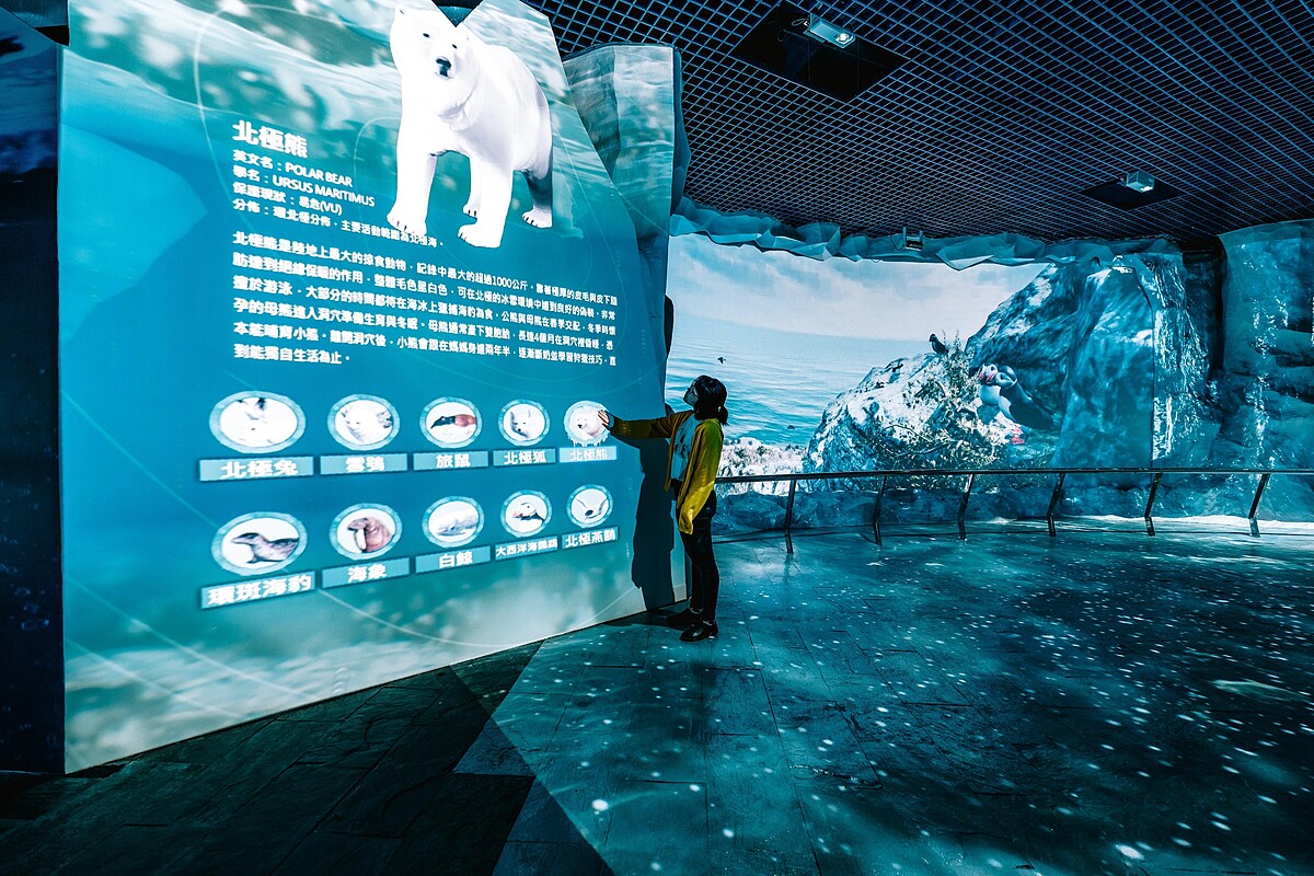 讓人驚喜的是,只要觸控互動螢幕上的生物圖示,即可進一步認識南北極生物,不僅趣味性十足,更可提醒遊客重視生態保育的重要,達到寓教於樂的效果!