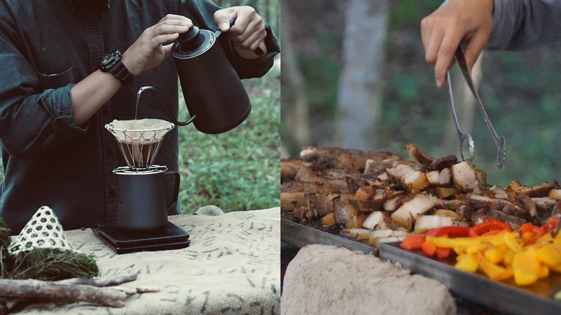 露營一大令人嚮往的,莫過於「野炊」!在燈光點綴的星光餐桌上,能品嚐保有大自然美味的佳餚,如熱石熟烤南瓜、干貝燉煮高麗菜封、獵人炭烤戰斧豬,煙燻鮭魚與酸柑蔬菜鍋,還有石板直火燒烤的原味,同時暖胃又暖心。晚上還能在很有台味風格的霓虹燈飆歌會場「SONG LA KTV」高歌飆嗓。