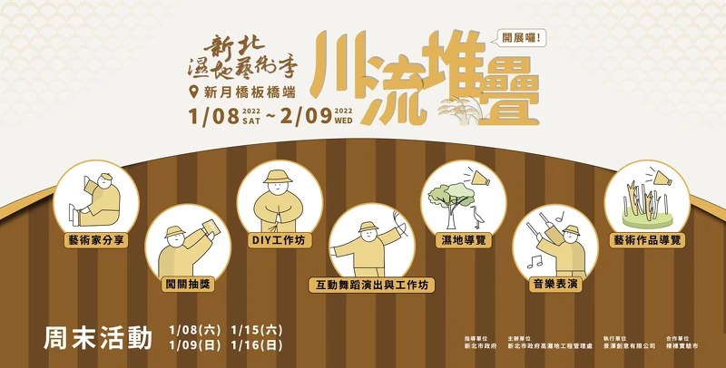 邁入第4屆的2022新北濕地藝術季,將以往只有淨化水質的濕地功能再提升,以「川流堆疊」為主題,集結多位藝術家、學校、里民與社區,把濕地變身成天然藝術館,堆積出人與河的全新記憶,而今年規模也相較往年更加擴大。