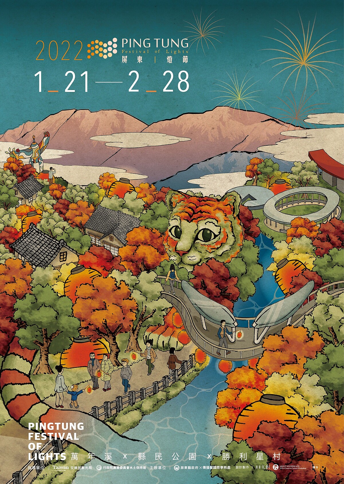 1/18當晚6點有開幕點燈儀式,會發放限量「虎年小提燈」讓大小朋友一起提燈同歡;還會再2/5晚上6點於縣民公園三層水池階梯演出山海屏行定目劇「海風的歌,山來唱」,藉由現代舞、原民舞蹈與不同國籍歌曲合唱,重溫台灣的鄉村文化。