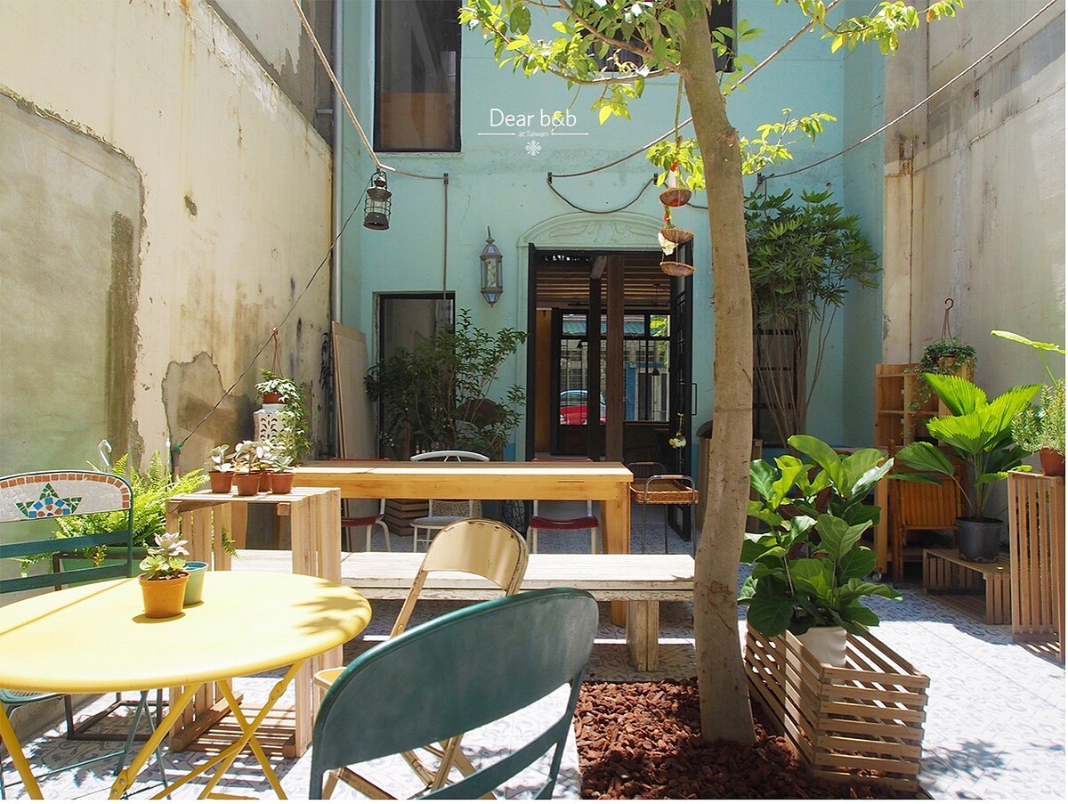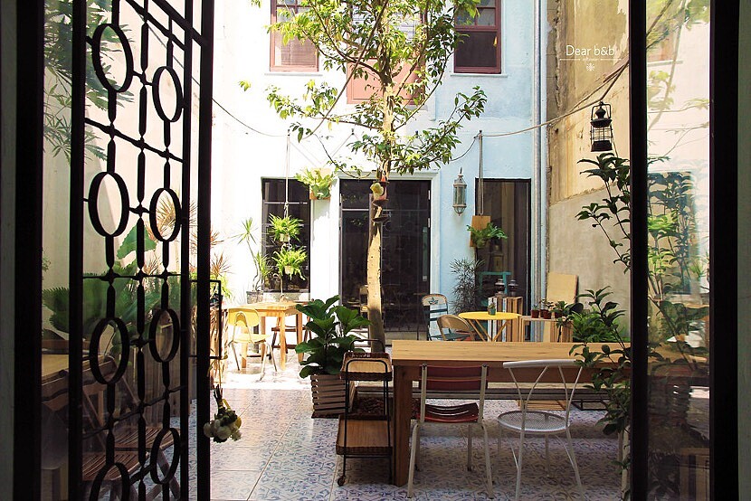 推開門後之門,天井裡的小中庭恍若巴黎小公寓的中庭,四面高牆渾然天井、綠葉蓊鬱,中央肉桂樹影篩落的陽光搖晃桌椅,在陽光潤澤裡感受光影隨時間挪移繪製的風景,享受昔日街屋的慢生活。