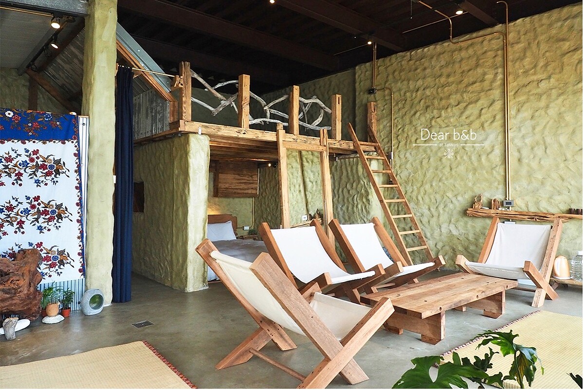 主人融合旅行攜回的紀念品與美感,民族風的手染布幔、蘊藏年月季節的木雕,也與熟稔的木工大哥合力打造家具,貼近大地原色的簡樸風格,佈置成嚮往的生活,也悄然呼應花蓮的山海。