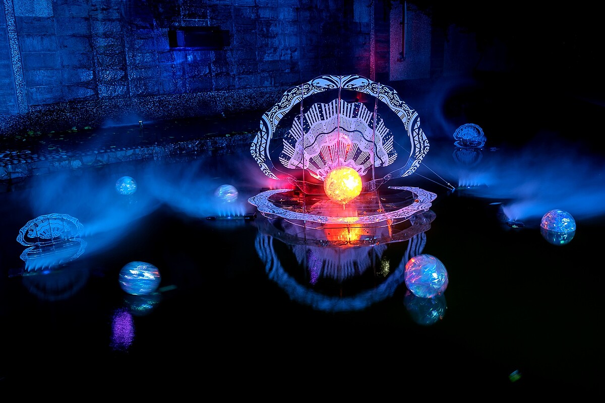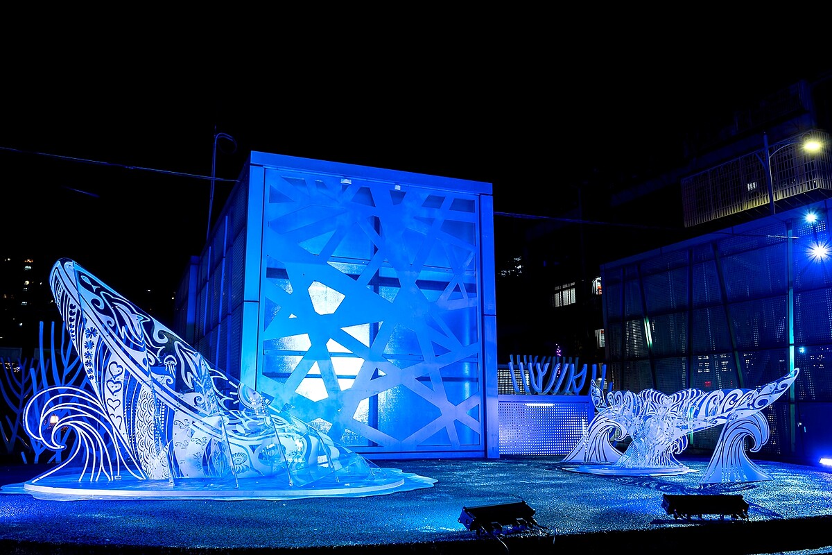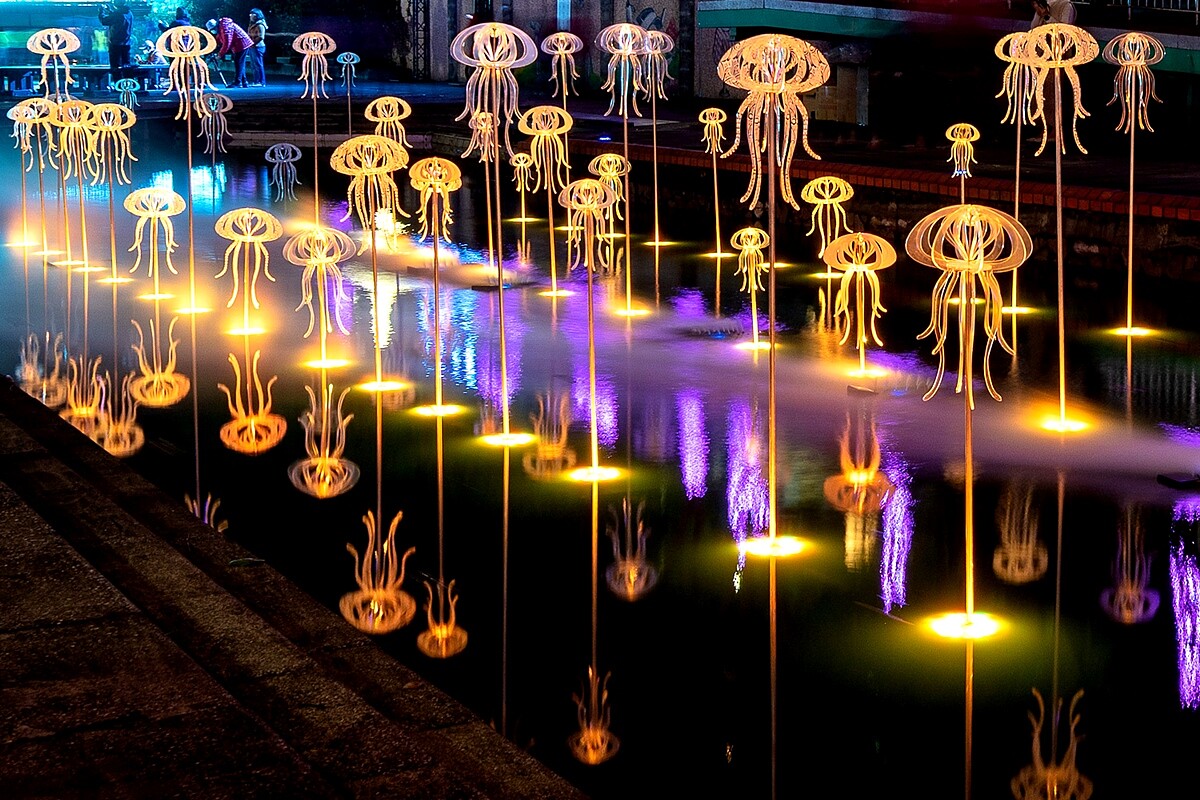 看完水舞秀後可別急著回家!中港大排自立廣場至中原路周邊規劃多達11座展區,不可錯過的有5公尺高的主燈「鯨夜躍您來」、拱門造型「鯨彩起點」、彩色水母排列的「母湯‧嘸去」以及呈現出幸福寓意的「幸福貝珍」、「心裝海洋」、「藍洋洋」等,綿延1.8公里的奇幻光雕作品,肯定能拍到心滿意足的網美大片。