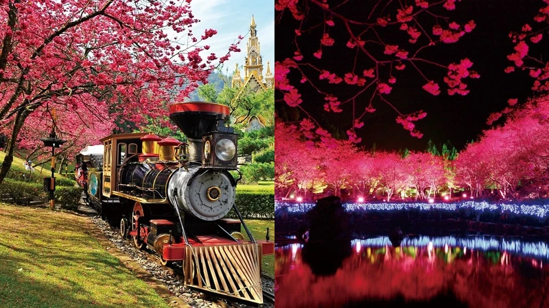想朝聖既顯眼又帶點挑逗意味的「暗影紅」花海,就啟程九族文化村!園區內種植超過5000多株八重櫻、吉野櫻、富士櫻,配上日式風格造景,如紫藤七福神社、祭典燈座,交織出濃厚的異國情懷。待夜幕低垂後就能親眼見證「暗影紅」的魅力,還有倒映在湖面上的櫻花林,相當引人入勝。