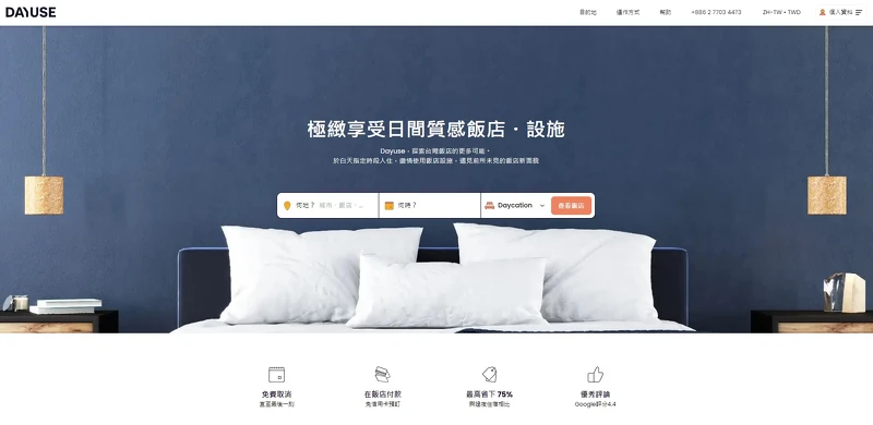 Dayuse於2022年春季正式登台,同樣秉持「日間住宿」賣點,提供最短入住6小時、最早於晨間8點便能Check In,也另有不同時段及時數等方案選擇。不需要過夜的嶄新旅遊模式,則可以為旅客省下25%~75%訂房住宿費,入住期間也能享受飯店的泳池、健身房等多種設施服務。