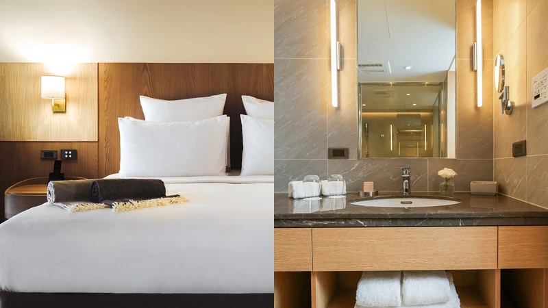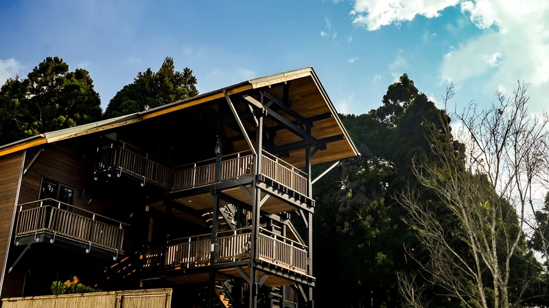 從遠處看,以檜木打造的「溪山行館」外型建築十分吸睛,這是寶元紀董事長蔡其建長久的夢想成真:擁有專屬的山林別邸。住宿旅客皆能遠眺被雲霧繚繞的山巒美景,還能在充滿日式侘寂美學的庭園造景中感受片刻寧靜,創造讓五感放鬆的愜意氛圍。
